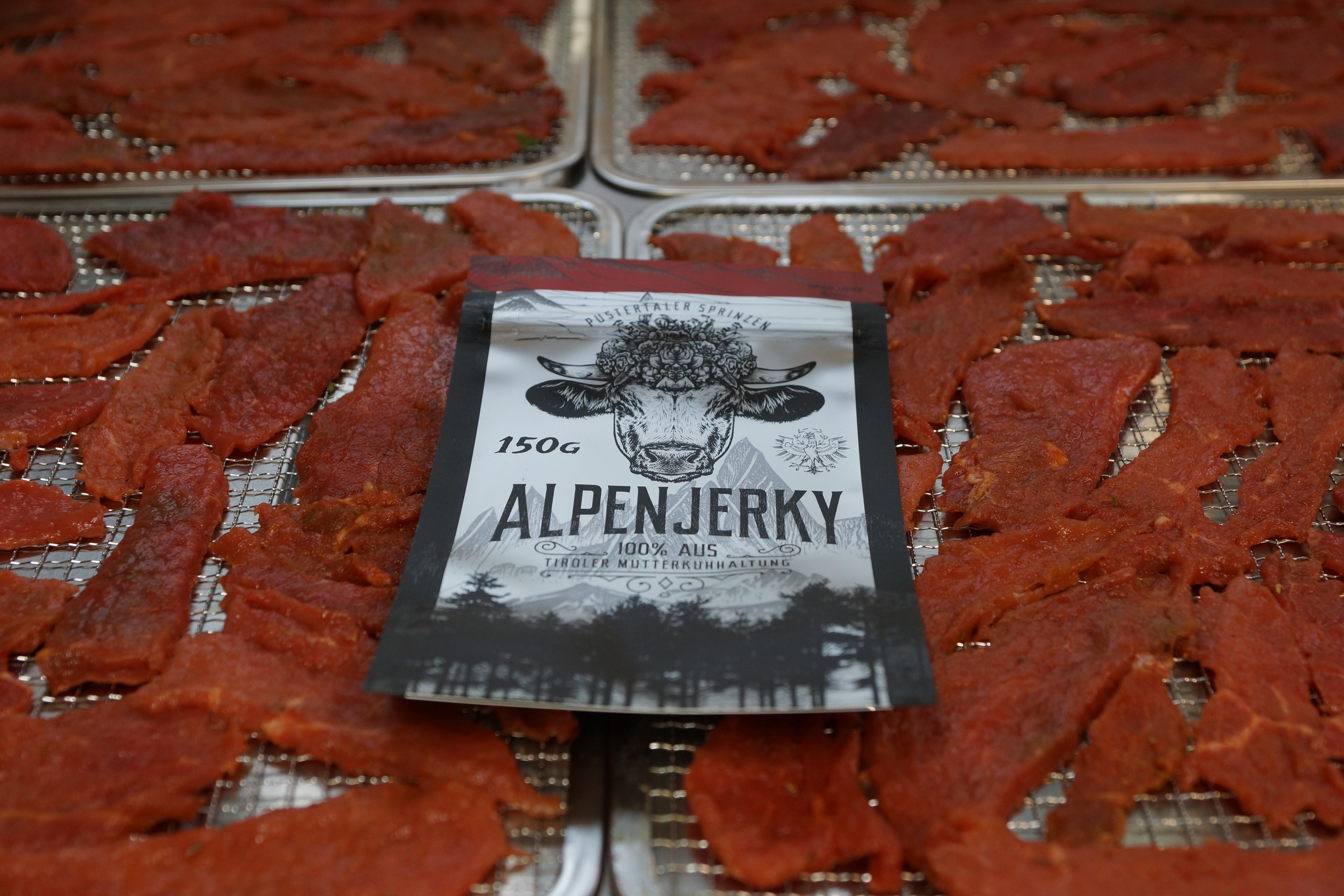 Dreijährige Pustertaler Sprinzen Ochsen. Drei Sommer auf der Alm. Reines Hochlagen-Heu im Winter. Handgeschnitten, gewürzt, getrocknet. Alpenjerky ist kein Snack – es ist ein Bekenntnis zur echten Herkunft.