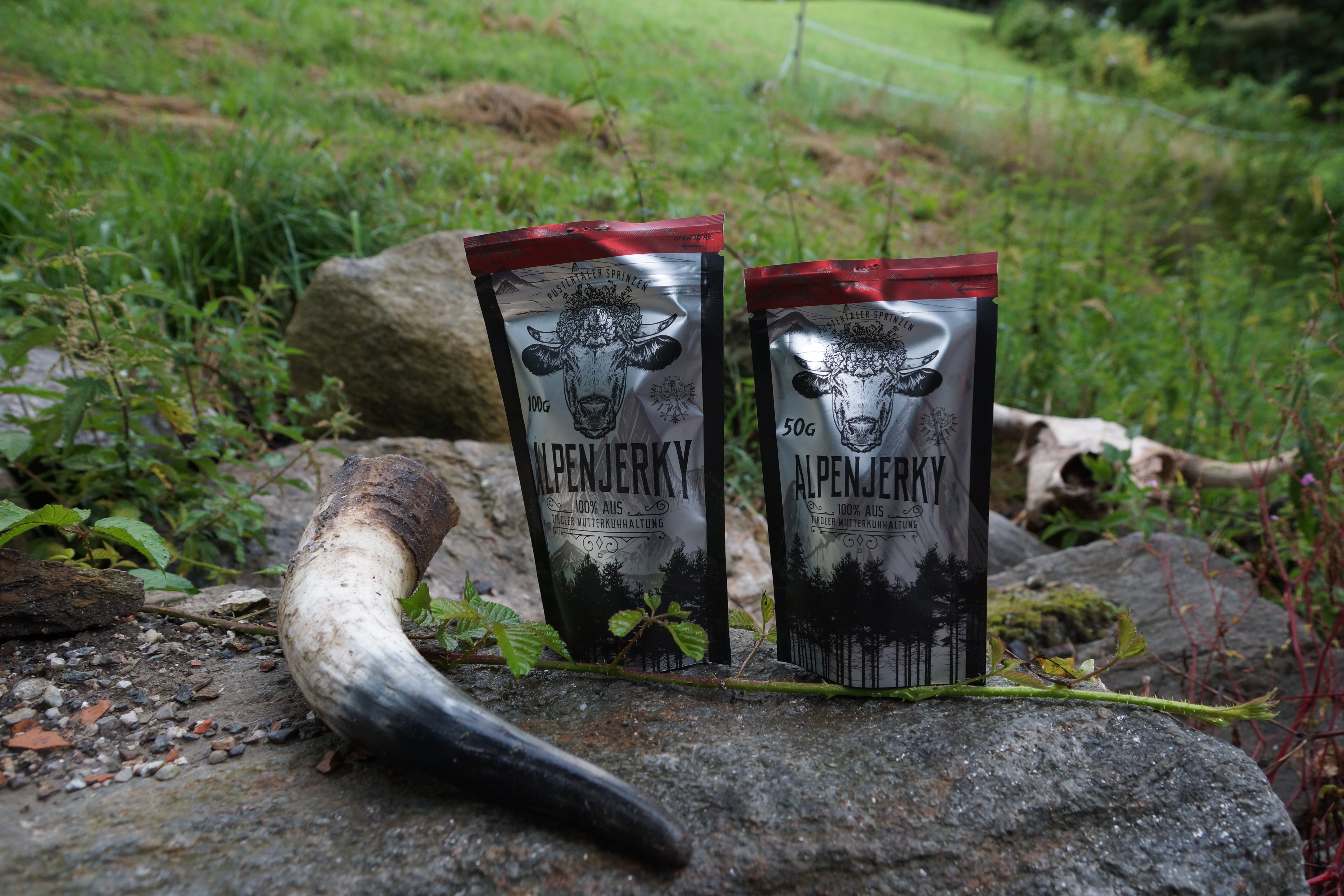 Dreijährige Pustertaler Sprinzen Ochsen. Drei Sommer auf der Alm. Reines Hochlagen-Heu im Winter. Handgeschnitten, gewürzt, getrocknet. Alpenjerky ist kein Snack – es ist ein Bekenntnis zur echten Herkunft.